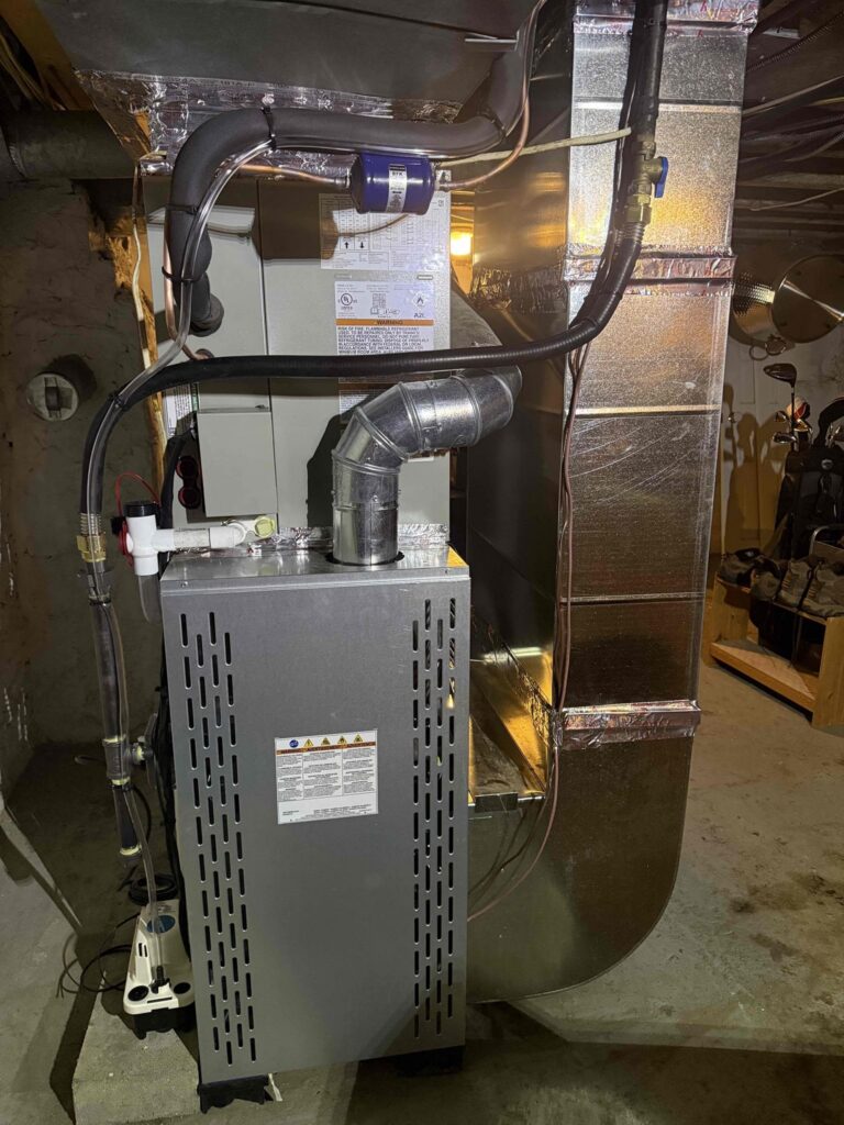 The indoor unit was located in an unfinished basement with ample working space, allowing for clean, efficient installation.